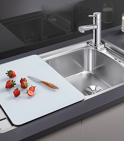 ‘Uniquely ergonomic’ là cách mô tả phù hợp nhất cho BLANCO AXIS. Khái niệm AXen thông minh mang đến quy trình làm việc mượt mà và tiện lợi dọc theo một trục. Với các góc bồn hẹp, bồn rửa lớn tạo không gian lưu trữ rộng rãi, lý tưởng cho đồ thủy tinh dễ vỡ hoặc đồ cồng kềnh. Bồn rửa inox tiết kiệm không gian đi kèm thớt kính di động tinh tế, tăng sự sang trọng và tiện dụng cho bếp. Bạn có thể chuẩn bị nguyên liệu ngay tại bồn rửa và thêm vào nồi khi cần. Rổ đa năng có thể tự do đặt trong bồn chính và dễ dàng gắn vào bằng tay cầm.