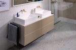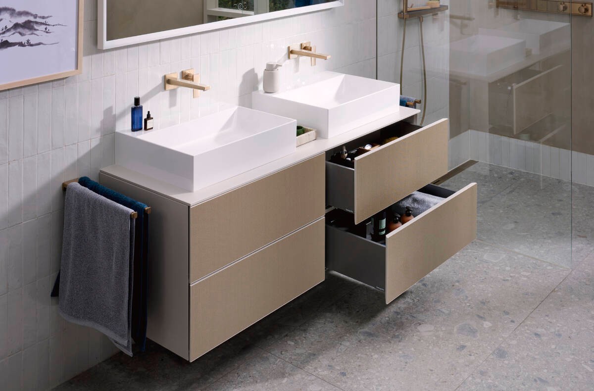 Tủ lavabo Xevolos E cũng gây ấn tượng với hệ thống PushOpen và SoftClose, bề mặt khung nhôm mỏng, và các tùy chọn vật liệu mặt trước như kính, gỗ veneer hoặc vải dệt – mang lại cảm giác vừa sang trọng vừa ấm cúng. Kích thước đa dạng từ 36 cm đến 120 cm, cùng khả năng phối hợp linh hoạt giữa chậu và tủ tạo giải pháp cá nhân hoá cho gia đình.